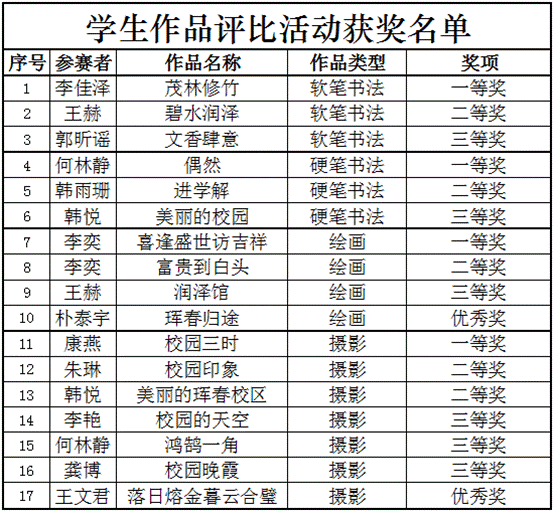 本次活动收集作品类别包括软笔书法、硬笔书法、绘画、摄影4种。活动中,同学们积极参与,踊跃报名,共上交作品31幅,作品内容丰富多彩,积极向上,充分展现出了同学们的才能。之后,经延边大学美术学院专业老师评选,共有17幅作品获奖,现将结果公布如下: